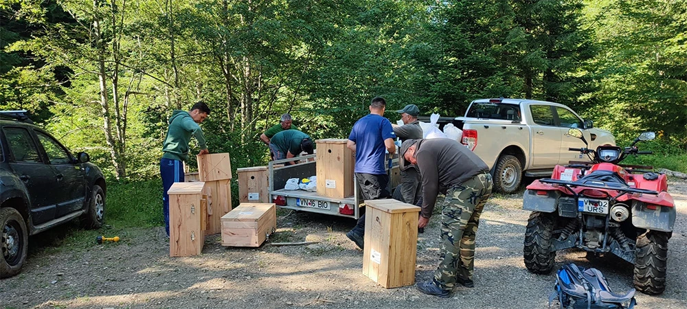 Sigur nu e ușor să montezi 200 de cutii din lemn de fag/stejar umplute cu material vegetal. Fiecare cutie are peste 30 de kilograme, un volum de circa 40 litri și imită arborii cu scorburi care oferă o cantitate mare de lemn mort pentru reproducerea insectelor saproxilice.